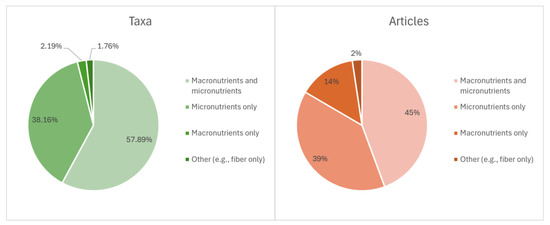 Visual representation of the percentage of taxa (left graph) and articles (right graph) reporting nutritional data on macronutrients, micronutrients or both, based on the compiled literature.