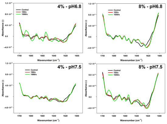 FTIR spectra of 4 or 8% FBPI dispersions held under different pH (6.8 or 7.5) subjected to a heat treatment (95 °C 30 min) and shearing (100 or 1000 s−1). The controls were not heated or sheared.