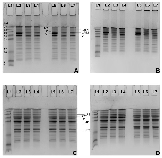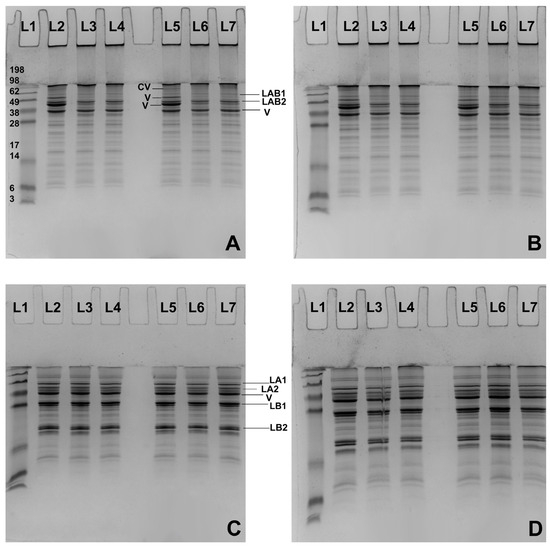 Non-reducing (NR) SDS-PAGE analysis of 4% (w/w) FBPI dispersions (bulk) and supernatant at a pH of 6.8 (A) or 7.5 (B) and reducing those of samples at a pH of 6.8 (C) or 7.5 (D). Lanes are designated as L1 molecular weight markers, L2 control bulk sample, L3 bulk sample heated 95 °C 30 min 100 s−1, L4 bulk sample heated 95 °C 30 min 1000 s−1, L5 control supernatant sample, L6 supernatant sample heated 95 °C 30 min 100 s−1, L7 supernatant sample heated 95 °C 30 min 1000 s−1. CV (convicilin), LAB1 (legumin A-B1), LAB2 (legumin A-B2), V (vicilin), LA1 (legumin acidic subunit 1), LA2 (legumin acidic subunit 2), LB1 (legumin basic subunit 1), and LB2 (legumin basic subunit 2).