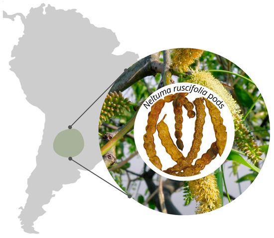 Neltuma ruscifolia (Griseb.) C.E. Hughes & G.P. Lewis, formerly known as Prosopis ruscifolia, is a woody leguminous species native to South America, particularly from the arid and semi-arid regions of Argentina, Paraguay, and Bolivia. It is currently classified as a Neglected and Underutilized Species (NUS) owing to its ecological resilience, multiple uses, and potential to contribute to sustainable food systems and to rural and economically disadvantaged regions [1,2]. Similar to other species within the genus Prosopis, N. ruscifolia has a long history of utilization by Indigenous and rural communities, who have traditionally consumed its pods as food and forage and used its wood as a source of fuel and for construction purposes [3,4]. These species have been valued since pre-Columbian times for their nutritional content and adaptability to harsh environments, representing an important cultural and subsistence resource. Nevertheless, N. ruscifolia remains largely overlooked in agricultural research, development policies, and commercial value chains [5]. Promoting the valorization of N. ruscifolia supports global efforts to enhance agrobiodiversity, food security, and rural livelihoods by integrating NUS into sustainable food systems [6,7].
