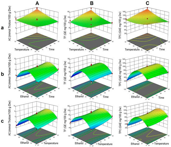 Response surface plots showing the optimization of vinal extract production by dynamic maceration. Each plot represents the effect of factor combinations (lowercase letters), namely, temperature vs. time (a), ethanol concentration vs. time (b), and ethanol concentration vs. temperature (c), on the responses (uppercase letters): antioxidant capacity (AC-DPPH assay-) (A), total flavonoid content (B), and total polyphenolic content (C). Red dots indicate the optimal extraction conditions.
