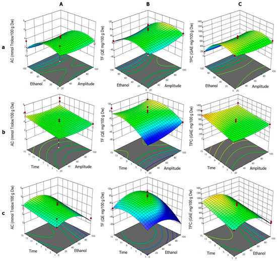 Response surface plots showing the optimization of vinal extract production by ultrasound-assisted extraction. Each plot represents the effect of factor combinations (lowercase letters), namely, ethanol concentration vs. amplitude (a), time vs. amplitude (b), and time vs. ethanol concentration (c), on the responses (uppercase letters): antioxidant capacity (AC-DPPH assay-) (A), total flavonoid content (B), and total polyphenolic content (C). Red dots indicate the optimal extraction conditions.