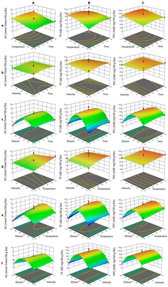 For TF (Figure 4B), the fitted quadratic model showed that the linear factors T, IN, and ET were significant. Also, it could be noted that the t·T interaction was the only significant interaction, and the quadratic terms t2, T2, and ET2 indicated notable nonlinear behaviors. In the t·T interaction (Figure 4Ba), TF extraction increased with time, peaking at low temperatures, while shorter times were required at high temperatures, suggesting thermal degradation, aligned with the t·T and T2 coefficients. The t·IN interaction (Figure 4Bb) showed that at longer times, high intensities reduced TF, reflected in the t·IN and IN2 coefficients. The ET–t combination (Figure 4Bc) displayed a bell-shaped curve, with a maximum near 50% ethanol, supported by t·ET and ET2. In the T·IN interaction (Figure 4Bd), higher TF values were obtained with low intensity at high temperatures, consistent with the T·IN coefficients. The T·ET interaction (Figure 4Be) showed a parabolic behavior, with a maximum around 50% ethanol, reflecting synergy between T and ET, as indicated by T·ET and ET2. The ET·IN interaction (Figure 4Bf) highlighted ET’s importance, while IN had a minor effect, consistent with corresponding coefficients.