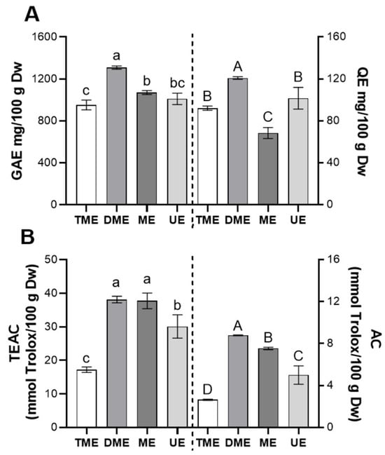 Comparison of the bioactivity of optimal vinal extracts obtained by different extraction methods. (A) Total polyphenols, expressed as mg of gallic acid per gram (vinal pod flour) on a dry weight basis (Dw), and total flavonoids, expressed as mg of quercetin per g Dw; (B) scavenging activity determined by the TEAC and AC assays, expressed as mmol Trolox per gram Dw. Extraction methods: traditional maceration (TME), dynamic maceration (DME), microwave-assisted extraction (ME), and ultrasound-assisted extraction (UE). Different letters indicate significant differences between extraction treatments (lowercase letters on the left; uppercase letters on the right) (Tukey’s test, p < 0.05).