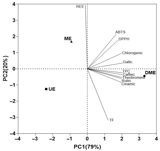 The second component (PC2), explaining the remaining 20.0% of the variability, can be interpreted as an axis of differentiation in terms of energy efficiency. On this axis, ME shows a positive association with higher REE, while UE appears on the negative end and is more closely associated with TF. This distribution suggests an inverse relationship between REE and TF content, indicating that methods with lower energy demand, such as UE, promote the extraction of flavonoids, whereas energy-intensive techniques like ME are less effective in this regard. Thus, PCA effectively differentiates the extraction methods based on both their capacity to recover bioactive compounds and their energetic performance.