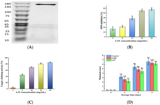 - Hong, Q.; Chen, Y.L.; Lin, D.Q.; Yang, R.Q.; Cao, K.Y.; Zhang, L.J.; Liu, Y.M.; Sun, L.C.; Cao, M.J. Expression of polyphenol oxidase of Litopenaeus vannamei and its characterization. Food Chem. 2024, 432, 137258. [Google Scholar] [CrossRef] [PubMed]