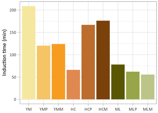 Induction times for insects before and after fermentation (YM: yellow mealworm, YMP: YM + L. plantarum, YMM: YM + commercial starter culture, HC: house cricket, HCP: HC + L. plantarum, HCM: HC + commercial starter culture, ML: migratory locust, MLP: ML + L. plantarum, MLM: ML + commercial starter culture).