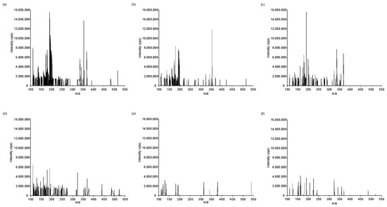Non-targeted FIA-MS fingerprints for selected (a) Vietnamese Arabica coffee, (b) Vietnamese Robusta coffee, (c) Cambodian coffee, (d) chicory, (e) flour, and (f) barley.