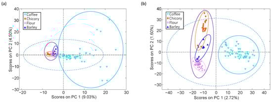 PCA score plots obtained using (a) FIA-MS and (b) LC-MS data to study coffee samples in front of chicory, flour, and barley adulterants.