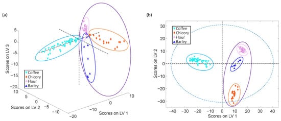PLS-DA score plots for (a) FIA-MS and (b) LC-MS data to study coffee samples in front of chicory, flour, and barley adulterants.