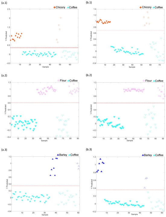 Paired PLS-DA score plots of Y predictions vs. samples for the data obtained using the (a) FIA-MS method and (b) LC-MS method to evaluate (1) coffee vs. chicory, (2) coffee vs. flour, and (3) coffee vs. barley. Filled and empty symbols correspond to calibration and prediction sets, respectively. Red lines represent the threshold between classes.