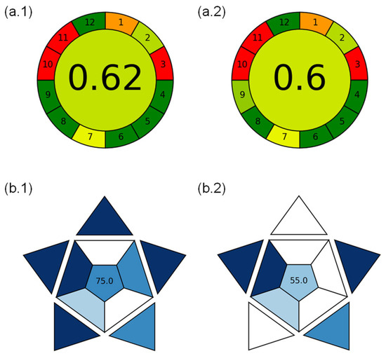 In Figure 5, the colors used in the greenness assessment (red, yellow, green, etc.) represent the performance of each individual criterion, where green indicates higher compliance with sustainability principles and red indicates lower compliance. For the blueness assessment, the shades of blue correspond to the scores of digitalization-related criteria, with darker blue representing a higher performance. This color coding allows for an intuitive visualization of the performance of the method in terms of environmental and digitalization metrics.