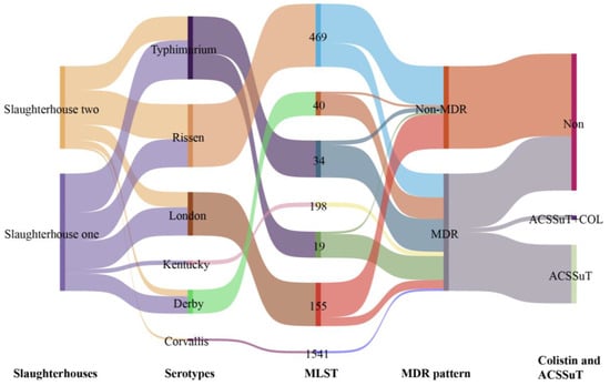Characterization of Salmonella isolates (n = 92) from pork products: slaughterhoues; serotypes; MLST; MDR patterns (Sankey plot). Rectangle height corresponds to the number of Salmonella isolates. The line graph depicts serotype distribution across slaughterhouses, while distinct colors represent different serotypes for STs, MDR status, colistin resistance, and ACSSuT resistance profiles.