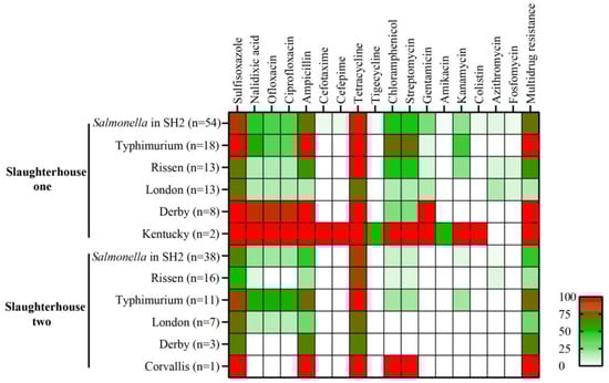 The serotype and antibiotic resistance diversity of Salmonella in two slaughterhouses. The average resistance distribution (in percent) of total Salmonella isolates and various serotypes in Slaughterhouse 1 and Slaughterhouse 2.