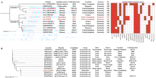 To evaluate the relationship between the two mcr-1-positive isolates from this study and other mcr-1-positive S. Kentucky isolates globally, we constructed a phylogenetic tree comprising 14 isolates (including our two isolates and 12 mcr-1-positive S. Kentucky isolates retrieved from NCBI and Enterobase databases) to assess clonality (Figure 3A). Our analysis revealed that mcr-1-positive S. Kentucky ST198 has been recovered from diverse sources, including humans, animals, and food. The isolates formed subclade I and subclade II. Notably, within subclade II, isolates from humans and poultry originating from countries such as France, the United Kingdom, and Morocco clustered with the isolates identified in this study. The small branch distances (scale bar < 0.1) among isolates in subclade II indicate a close genetic relationship despite their diverse origins. Specifically, our isolates (Sal_P23040 and Sal_P23041) were most closely related to a clinical human isolate (traces-0lhyZjN) from France. Among all mcr-1-positive isolates, ARGs conferring resistance to sulfonamides (sul1) and quinolones (gyrA (S83F) and parC (S80I)) were the most prevalent (14/14, 100.0%), followed by tet (A) (13/14, 92.9%) and blaTEM-1B (11/14, 78.6%). Importantly, blaCTX-M-55 and qnrS1 were detected exclusively in the isolates from this study. These findings suggest a potential role for the food chain in the dissemination of mcr-1-positive S. Kentucky in China.