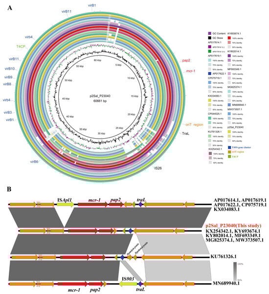 WGS of the mcr-positive isolates was performed on the Illumina platform (150 bp paired-end reads). For the mcr-1-positive isolate Sal_P23040, complete genome assembly was achieved through long-read sequencing on the PacBio platform using ≥100× coverage. Plasmid replicons and antimicrobial resistance genes (ARGs) were characterized using the web-based tools PlasmidFinder 2.1 and ResFinder 4.1 (https://www.genomicepidemiology.org/ (accessed on 9 May 2025)). The origin of transfer (oriT) for mobilized genes was predicted with oriTfinder (https://bioinfo-mml.sjtu.edu.cn/oriTfinder/ (accessed on 9 May 2025)). Comparative genomic visualization of the mcr-1 genetic context employed Easyfig 2.1 [26] and BRIG 0.95 [27].