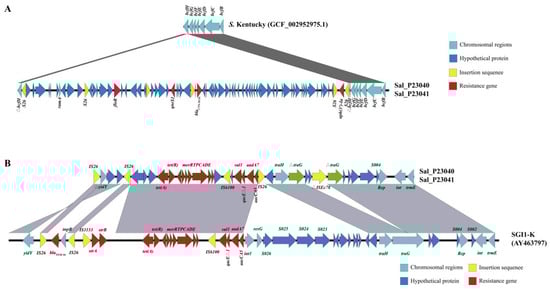 Molecular characteristics of the multidrug resistance region and Salmonella Genomic Island 1. (A) Linear comparison of the genetic structure of the multidrug resistance region (MMR) inserted into the bcfH gene in S. Kentucky ST198 isolates. Chromosomal genes are marked in light blue, while insertion sequences (IS) and resistance genes are marked in yellow and red, respectively. (B) Linear comparison of the genetic structure of the Salmonella Genomic Island 1 (SGI1) variant inserted downstream of the trmE gene in S. Kentucky ST198 isolates. Results compared with the reference SGI (AY463797). Resistance genes are marked in red as shown in the legend, and insertion sequences (IS) are marked in yellow. The gray shadowing denotes BLASTn matching regions.