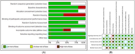 Clinical Trials: A low risk of bias was identified in random sequence generation and allocation concealment in four of the six studies. However, two studies presented a moderate risk due to a lack of detail in the randomization methodology. Detection bias was low in most trials, but one study did not specify whether assessors were blinded to treatment. Reporting bias was low in all included studies (Figure 2).