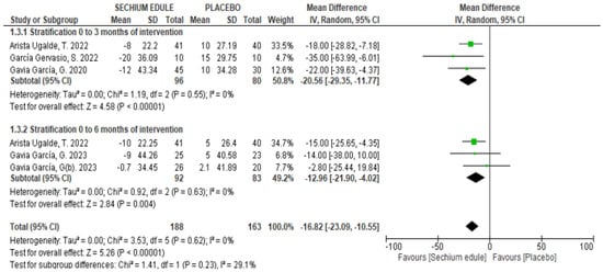 | MD (0–3 Months): −18 [CI 95% −28.82, −7.18] | MD (0–3 Months): −1.00 [CI 95% −1.43, −0.57] | |||||||||||||||||||||||||