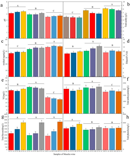 Chemical and antioxidant properties of Musalais wine produced by different fermentation temperatures after concentrating the grape juice to different Brix levels. Note: Fermentation temperatures of 22 °C, 25 °C, and 28 °C were used to concentrate grape juice at 100 °C to different Brix levels of 26 ° (A), 29 ° (B), and 32 ° (C). (a): pH; (b): Total acidity (g/L); (c): residul sugar (g/L); (d): Ethanol (% Vol); (e): VC (mg/L); (f): Total anthocyanin (mg/L); (g): Total flavonoid (mg/L); (h): Total phenolic (mg/L). Different lowercase letters denote statistically significant differences between the Brix at the same fermentation temperature of the total acidity, residual sugar content, pH, ethanol, VC, total anthocyanin, total phenolic content, and total flavonoid content. Different capital letters denote statistically significant differences among the fermentation temperatures of the total acidity, residual sugar content, pH, ethanol, VC, total anthocyanin, total phenolic content, and total flavonoid content. All statistics were determined by Duncan’s multiple range test.