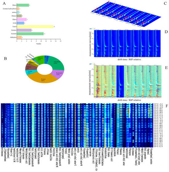 Characteristics of volatile flavor compounds in Musalais wine with different brewing processes, and the qualitative analysis of volatile compounds. (A) Number and percentage of volatile compounds; (B) proportion of volatile flavor compounds; (C) three-dimensional GC-IMS spectra; (D) two-dimensional GC-IMS spectra; (E) differential GC-IMS spectra and two-dimensional GC-IMS spectra; (F) fingerprint spectrum of volatile compounds identified in Musalais wine samples by GC-IMS. Note: The colors represent the concentration of the substance, with white indicating a lower concentration, red indicating a higher concentration, and darker colors indicating a greater concentration.