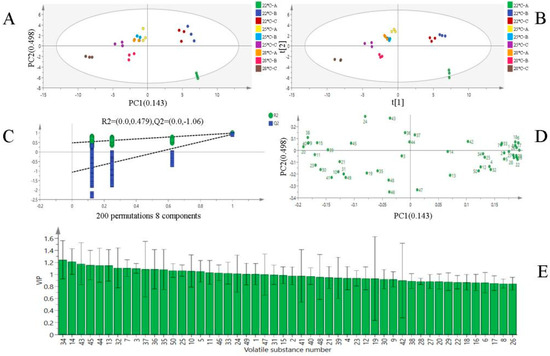 OPLS-DA analysis of Musalais wine after different fermentation treatments. PCA analysis (A,B); OPLS-DA score plot (C); confidence test results (D); VIP value distribution of volatile substances (E).