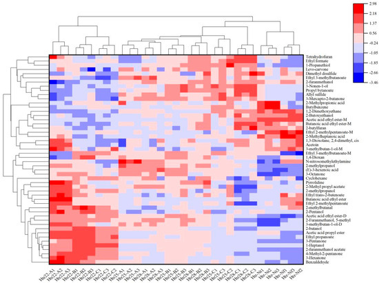 Cluster analysis was performed on the VOCs of Musalais wine with different brewing and fermentation conditions. The results are shown in Figure 4, where the Y-axis represents the names of VOCs identified by GC-IMS, and the X-axis represents the origin codes. The VOCs of nine Musalais wine samples are clustered into two major groups: 22 °C-A, B and C belong to one group, while 25 °C-A, B, C and 28 °C-A, B, C belong to another. Of these, 22 °C-B and C are similar in flavor and form a group. The results of the cluster analysis are consistent with those of PCA, indicating that fermentation temperature and juice Brix may affect the formation of VOCs in Musalais wine.