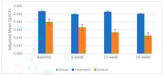 The mean ± SE QUICKI at baseline was slightly higher in the treatment group compared to the control group (0.35 ± 0.01 vs. 0.34 ± 0.01); however, the difference was not statistically significant. Race demonstrated a significant interaction with the QUICKI and was therefore included as a covariate in the analysis. Throughout this study, the mean QUICKI remained almost stable in the treatment group, while it declined in the control group (from 0.34 ± 0.01 to 0.32 ± 0.01), which resulted in a statistically significant difference between the groups at week 24 (p < 0.02). The adjusted mean QUICKI changes over the study period for both groups are shown in Figure 1.