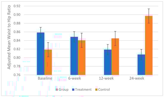 Changes in mean waist–hip ratio over the 24-week study period. Participants visited the lab at baseline and weeks 6, 12, and 24. Error bars represent standard errors of the mean (SEM).