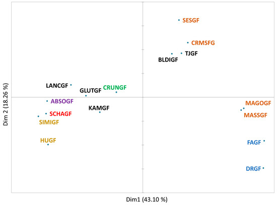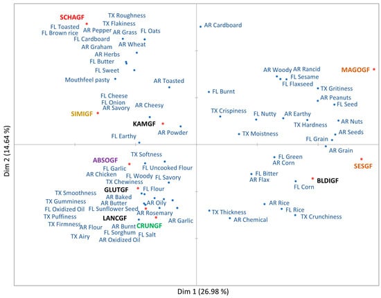 The PM technique was applied to the selected crackers using a consumer panel. The data obtained in PM were plotted using MFA (Figure 1). Both dimensions (Dim) explained 61.36% of the variability. Flaxseed crackers (DRGF and FAGF) contributed most to both Dims, demonstrating noticeable large sensory differences from the rest of the cracker samples. Crackers with nut-blend-based flour (HUGF and SIMIGF) and brown rice crackers (MAGOGF and MASSGF) influenced the x-axis (Dim 1) to a greater extent, implying that consumers perceived them very differently. For Dim 2, the main contributors were brown rice crackers (SESGF and CRMSFG) and white rice crackers (TJGF and BLDIGF). The distinct text colors of the product names represent different grain sources: orange for brown rice, black for white rice, blue for flaxseed, green for cassava flour, yellow for nut flour blend, red for millet blend, and purple for tapioca/potato starch blend. The spatial placement of crackers on the MFA plot suggests four different product groups. The largest group had eight crackers placed together: GLUTGF, LANCGF, CRUNGF, ABOSGF, SIMIGF, KAMGF, SCHAGF, and HUGF. The crackers in this group had white rice, cassava flour, tapioca/potato starch blend, millet blend, and nut blend as major ingredients in their formulations, respectively. The second largest group had four products: brown rice crackers (SESGF and CRMSGF) and white rice crackers (TJGF and BLDIGF). Additionally, two brown rice crackers (MAGOGF and MASSGF) seem to have very similar sensory characteristics between them, but they were different enough from the other brown rice crackers (SESGF and CRMSFG) to remain more distant. The flaxseed crackers (DRGF and FAGF) were close to each other due to their distinct strong aroma and flavor of flaxseeds. The PM technique was effective; consumers were able to segregate samples based on sensory differences mostly between crackers made with different base flour types. Finally, based on the PM results, only 10 GFC samples (with asterisk (*) symbols in Table 1) were selected for further investigation using MFP and DA.