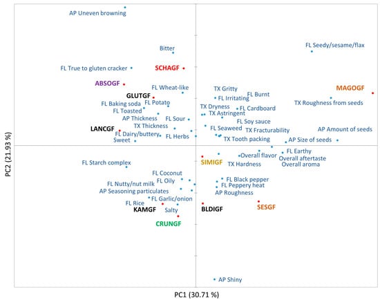 The brown rice crackers (MAGOGF and SESGF) were clearly different from the other samples regarding the amount and size of seeds, roughness emerging from seeds, and earthy, burnt, and cardboard characteristics. Nevertheless, the nut blend (SIMIGF) crackers and one variety of white rice (BLDIGF) crackers had different grain types but were positioned similarly. They were characterized by brittle texture (fracturability), nutty, and oily flavor. The samples SCHAGF, ABSOGF, GLUTGF, and LANCGF were located on the positive axes of PC1 and PC2, mainly described as thick, bitter, baking soda, toasted, and uneven browning. The millet blend sample was associated with unique characteristics of wheat, sesame/flax seeds, and toasted; the tapioca flour cracker (ABSOGF) was described as dry, potato, and burnt; two white rice crackers (GLUTGF and LANCGF) had starch complex and rice notes. The cassava flour crackers (CRUNGF) and one white rice cracker (KAMGF) were distinct for their shiny appearance but shared many sensory properties similar to other white rice crackers (GLUTGF and LANCGF). The DA results indicated that the GFC samples were relatively well differentiated in appearance, texture, and flavor. In addition, the samples could be largely grouped by their similarities, such as those of white rice crackers (GLUTGF and LANCGF) and brown rice crackers (MAGOGF and SESGF). However, the spectrum of differences is less varied and diverse, probably due to the limited range of GF crackers available in the market [12].