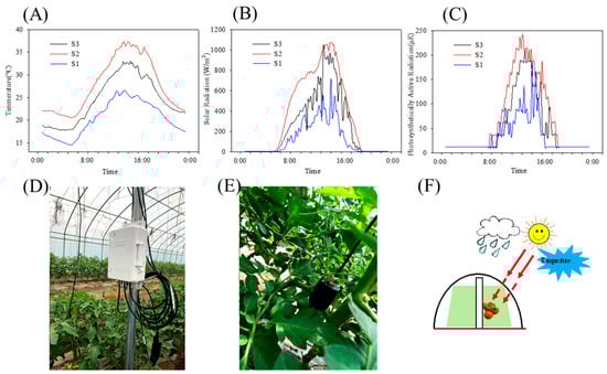 Changes in the temperature (A), solar radiation (B), and PAR (C). Meteorological data collectors (D,E) around the fruit cluster. (F) Simple diagram of greenhouse cultivation.