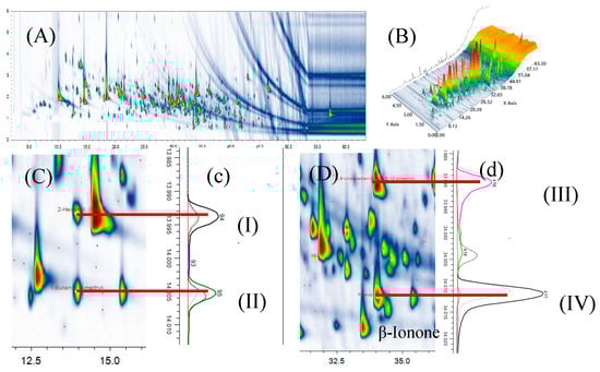 GC × GC-Q/TOFMS chromatograms of 2D and 3D diagram of volatiles from tomatoes (A,B); GC × GC plot (C,D) corresponding to the chromatography in the second dimension (c,d). I: 2-Hexenal, (E); II: 1-Butanol, 3-methyl-; III: 5,9-Undecadien-2-one,6,10-dimethyl-; IV: Phenol, 2-methoxy-.