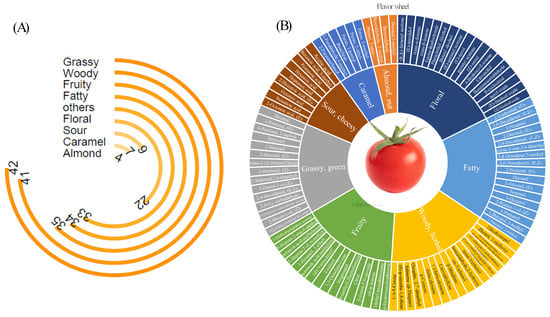 Analysis of volatiles in tomatoes. (A): radial bar chart representing the quantities of different aroma types; (B): the flavor wheel of key volatiles in tomatoes. Note: the outermost ring shows the names of the volatiles, and the middle ring shows the sensory flavor characteristics of volatile compounds.