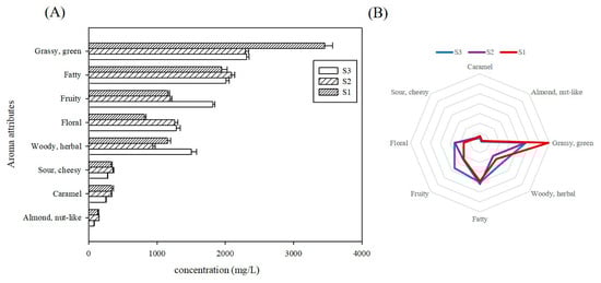 To systematically compare the organoleptic flavor profiles among tomatoes cultivated for varying durations, a bar chart was constructed of the cumulative concentrations of distinct aroma types (Figure 4A). A sensory flavor profile radar chart (Figure 4B) was constructed using the cumulative contribution values derived from semi-quantitative concentration data. The results revealed that the green-grassy odorants had the highest content, with S1 showing the most intense grassy character among the three cultivation periods. Fatty flavors constituted the secondary category with higher levels, though no statistically significant variations were observed across these samples (p < 0.05). These were followed by fruity, floral and woody/herbal flavor, with S3 exhibiting the significantly highest fruity and woody flavor, while S1 showed the lowest floral flavor. The lowest woody flavor was observed in S2. These were the prominent aroma features for the volatiles detected in tomatoes in this study. No statistically significant differences were observed for the remaining three odor categories across cultivation timepoints.