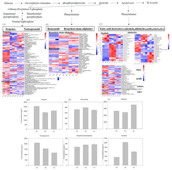 According to precursor-mediated biosynthetic routes, the volatile compounds were classified as fatty acid-derived volatiles (e.g., C6/C9 aldehydes and lactones), amino acid-derived volatiles (e.g., branched-chain aldehydes and alcohols) and isoprenoid-derived volatiles (terpenes and their derivatives) [25]. Some compounds with undetermined metabolic pathways were excluded from this analysis (Figure 5).