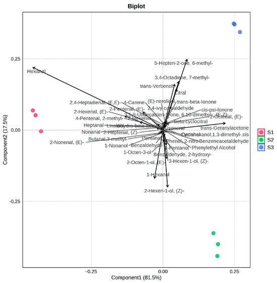 PCA was conducted to evaluate and categorize the volatile profiles of tomatoes with different cultivation periods, using all detected volatile compounds as variables. The first two principal components (PC1 and PC2) accounted for the majority of flavor characters of these three tomato samples (Figure 6). The Biplot illustrates the top 40 volatile substances (base on VIP values) that contribute most significantly to distinguishing the three samples. Hexanal, (E)-2-hexenal, nonanal, (E)-2-octenal, trans-geranylacetone, 6-methyl-5-hepten-2-one, 7-methyl-3,4-octadiene, and citral were found to be the key volatiles contributing most significantly to differentiating the samples across cultivation periods. These compounds imparted grassy and floral–fruity notes, respectively. In the PCA results, the S1 group was positioned on the negative axis of PC1, which demonstrated a positive correlation with higher contents of aldehydes, particularly hexanal. By contrast, the S2 and S3 groups were positioned along the positive direction of PC1, with further separation along PC2. S2 was located along the negative direction of the PC2 axis, and S3 was located along the positive direction of the PC2 axis. These results show that the S2 samples were characterized by fatty alcohols and some amino acid-derived volatile compounds (e.g., benzenoids such as benzaldehyde, phenylethyl alcohol). Meanwhile, the S3 samples were positively correlated with isoprenoid-derived volatiles—terpenoids and norisoprenoids.