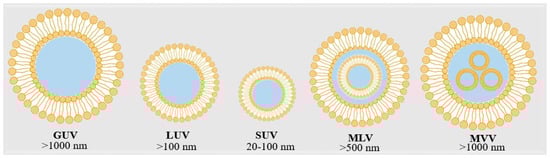 Unilamellar vesicles (ULVs) possess a single phospholipid bilayer and are classified by size into small unilamellar vesicles (SUVs, 20–100 nm), large unilamellar vesicles (LUVs, 200–500 nm), and giant unilamellar vesicles (GUVs, >1000 nm) (Figure 2). SUVs are preferred for targeted delivery due to their small size and tissue penetration ability, while LUVs and GUVs are better suited for applications requiring prolonged circulation and sustained release [27,28]. Multilamellar vesicles (MLVs), comprising multiple concentric bilayers, offer higher encapsulation efficiencies, particularly for hydrophobic compounds, due to their greater phospholipid content and surface area. This multilayered structure also enhances stability and supports gradual release kinetics [29]. Multivesicular vesicles (MVVs) contain several discrete vesicles enclosed within a larger liposomal core, enabling simultaneous encapsulation and release of multiple agents, which is advantageous for complex therapeutic strategies [29].
