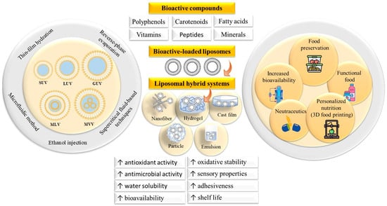 Owing to their amphiphilic nature, liposomes offer a versatile platform for encapsulating both hydrophilic and hydrophobic food bioactive compounds. This dual-loading capacity facilitates the functional delivery of a wide range of nutraceuticals and functional ingredients. Various classes of food bioactive compounds, including vitamins, polyphenols, carotenoids, and omega-3 fatty acids, have been successfully encapsulated into liposomes. The application of liposome-encapsulated bioactives in food matrices is aimed at amplifying the antimicrobial potential, bioavailability, and bioaccessibility, increasing intestinal absorption, improving flavor profiles, and enhancing the overall functionality and quality of foods.