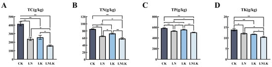 Under sufficient nutrient supply, the roots of P. ginseng exhibited relatively high levels of total carbon, TN, total phosphorus (TP), and total potassium (TK), highlighting the importance of adequate N and K supply for ginseng growth and mineral accumulation. As shown in Figure 1, the LN treatment caused a significant decrease in TN content, while the LK treatment significantly reduced TK content and led to a decline in TP content. This suggests that N and K play crucial roles in phosphorus absorption and utilization in ginseng. Under the combined LNLK treatment, the levels of N, phosphorus, K, and OM in ginseng roots were reduced to their lowest values.