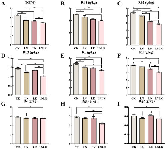 Figure 2 shows the TG content and the levels of various individual ginsenosides (Rb1, Rb2, Rb3, Rc, Rd, Re, Rg1, and Rg2) in the roots of P. ginseng under four different treatments. Under normal CK conditions, the TG and individual ginsenoside contents in the ginseng roots reached their highest levels, indicating that adequate nutrient supply promotes comprehensive synthesis and accumulation of ginsenosides. In the LN group, TG content and most individual ginsenosides (Rb1, Rb2, Rb3, Rc, Rd, and Rg1) significantly decreased, suggesting that LN influences enzyme activities and metabolic pathways involved in ginseng saponin synthesis, thereby inhibiting ginsenoside production. Additionally, the content of Re saponin decreased under N-deficient treatment; however, its decline was relatively smaller, which may indicate that the synthesis of Re saponin is less dependent on N. Under LK treatment, the total saponin and individual ginsenoside contents significantly decreased compared to those in the normal nutrient supply group, although the decline was less pronounced than that under N deficiency. This may be because K primarily regulates osmotic pressure and ion balance in plant cells, with a relatively smaller direct impact on saponin synthesis. However, LK still negatively affects ginseng growth and metabolism, indirectly influencing saponin production. Under the LNLK treatment, the contents of total saponins and individual ginsenosides in the roots of ginseng were reduced to the lowest levels. This result further confirms the synergistic effect of N and K on ginsenoside synthesis. In the absence of these two key nutrients, the growth and metabolism of ginseng are severely inhibited, leading to a significant decline in saponin synthesis capacity.