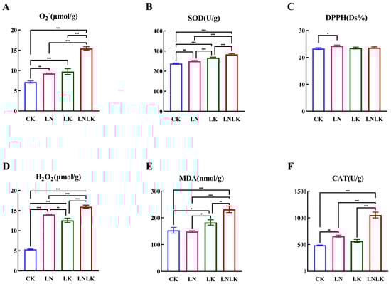 Effect of nitrogen and potassium deficiency on the antioxidant enzyme activity of ginseng. (A) O2− content. (B) SOD content. (C) DPPH content. (D) H2O2 content. (E) MDA content. (F) CAT content. * p < 0.05, ** p < 0.01, *** p < 0.001.