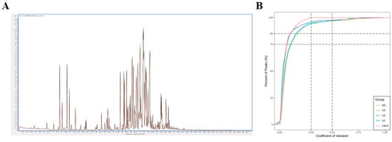 Quality control (QC) samples: mass spectrometry detection TIC overlap diagram and CV distribution diagram for each group of samples. (A) Total ion current (TIC) map of QC sample mass spectrometry analysis. (B) Coefficient of variation (CV) distribution map of metabolite peak areas for each group of samples. The horizontal axis represents CV values, and the vertical axis represents the proportion of substances with CV values less than the corresponding CV value out of the total number of substances. Different colors represent different groups of samples, with QC representing the quality control sample.