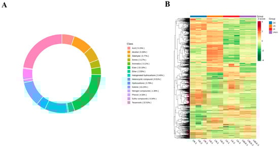 Circular plot of metabolite category composition and clustering heatmap of metabolite abundance. (A) Circular plot illustrating the composition of metabolite categories. (B) Hierarchical clustering heatmap of volatile metabolite abundance in ginseng roots under four treatments. The color gradient represents the accumulation levels of each metabolite, ranging from low (green) to high (red), with darker hues indicating higher metabolite content.