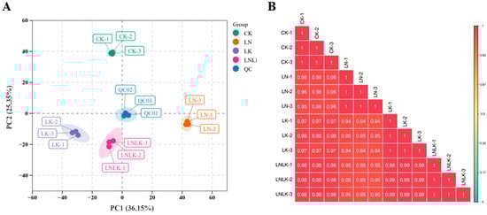 PCA reduces the dimensionality of metabolomics data by extracting principal components (PCs) to reveal the internal structure of multivariate datasets. PCA score plots thus enable the visualization of intergroup differences. Unsupervised PCA was performed to assess variations between the treatment groups, within the groups, and among the individual samples (Figure 6A). The first two PCs accounted for 36.15% (PC1) and 25.35% (PC2) of the total variance, respectively, with a cumulative contribution rate of 61.50%. Distinct separation among the four treatment groups was observed in the 2D score plot, without detecting outliers. The samples from the same treatment clustered tightly, indicating significant metabolic divergence between the treatments. Quality control samples, prepared as pooled mixtures of ginseng root extracts, were projected within a confined region of the PCA space, with partial overlap indicating metabolic similarity. This clustering consistency validates analytical stability and reproducibility, supporting further downstream analyses. Correlation analysis (Figure 6B) revealed strong intra-group reproducibility, with correlation coefficients (r) of >0.8 between the biological replicates. These results indicate that the metabolic differences induced by the different treatments are highly reliable.