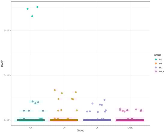 The rOAV is a metric for identifying key flavor compounds by incorporating odor thresholds, elucidating individual contributions to the overall aroma profiles. The significance of volatile compounds depends on two factors: concentration and odor threshold. Compounds with rOAV of ≥1 are generally considered direct contributors to flavor perception [41,42]. Based on the qualitative and quantitative results obtained from GC–MS, the threshold values of the corresponding aroma compounds in water were identified through literature searches [1,2,3,4]. Compounds without reported threshold values or those below the quantitative detection limit were excluded, and their rOAVs were calculated. Among 1768 metabolites, 304 aroma compounds exhibited an rOAV of ≥1 across treatments, including 54 terpenoids, 55 esters, 30 ketones, 36 heterocyclic compounds, 31 alcohols, 44 aldehydes, 1 carboxylic acid, 23 phenols, 2 hydrocarbons, 3 amines, 15 aromatic hydrocarbons, 4 ethers, 3 N-containing compounds, 1 halogenated hydrocarbon, and 2 sulfur-containing compounds. These constitute the primary contributors to the characteristic aroma of ginseng. Figure 7 (rOAV scatter plot) shows a clustered distribution of high-rOAV compounds in the control group, suggesting enhanced contributions of specific aroma-active substances under nutrient sufficiency.