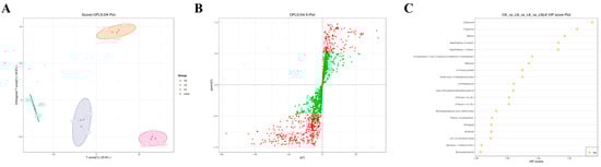 To identify characteristic volatile compounds associated with nutrient-induced metabolic shifts in ginseng roots, a quantitative correlation model linking volatile profiles and sensory attributes was developed using PCA integrated with OPLS-DA. OPLS-DA, a supervised multivariate algorithm derived from PLS-DA, incorporates orthogonal signal correction to partition X-matrix information into Y-correlated and Y-uncorrelated components. This enhances model specificity by isolating biologically relevant variations in the first predictive component, thereby optimizing differential metabolite screening [43,44]. The OPLS-DA score plot (Figure 8A) showed clear segregation among the four treatment groups, with minimal intra-group variation and complete intergroup separation, consistent with PCA results. Permutation testing (n = 200) confirmed model robustness, as the original model’s R2 (0.92) and Q2 (0.85) exceeded permuted Y-matrix values (R2 = 0.21, Q2 = −0.38), validating its predictive reliability. Variables with VIP of ≥1 were selected as differential VOCs. The S-plot is a critical output of the OPLS model that visualizes the extent to which the variables contribute to the model (Figure 8B). Figure 8C (VIP-ranked differential metabolites) shows that the top 20 metabolites with the highest VIP values were predominantly distributed across aromatic hydrocarbons, esters, terpenoids, phenols, and alcohols.