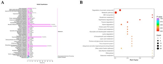 KEGG differential enrichment categorization map and KEGG differential enrichment bubble map. (A) KEGG differential enrichment classification plot. (B) KEGG differential enrichment bubble plot.