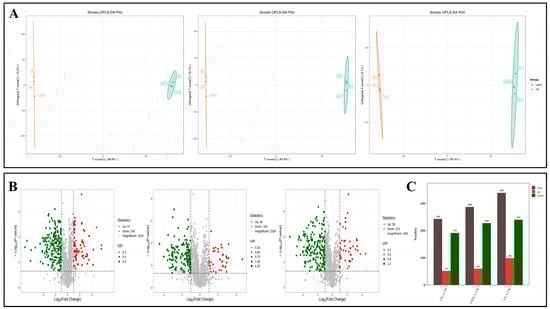 Corresponding subgroup OPLS-DA score plots, volcano plots, and statistics of the number of differential metabolites. (A) OPLS-DA score plots of volatile metabolites of ginseng roots among different treatment groups. (B) Volcano plot of differential metabolites among different treatment groups. (C) Statistical plots of the number of differential metabolites in ginseng roots under different treatments. Note: Each dot in the volcano plot represents a metabolite, and the size of the dot represents the variable importance (VIP) value in the project. In the volcano plot, the larger the absolute value of the horizontal coordinate, the more significant the differential expression is, and the more reliable the differential metabolites screened. The green dots in the plot represent downregulated differential metabolites, the red dots represent upregulated differential metabolites, and the gray dots represent the metabolites detected with no significant difference. In the graph of the number of differential metabolites, red represents the number of upregulated differential metabolites of the latter relative to the former in the comparison group, green represents the number of downregulated differential metabolites, and gray represents the total number of differential metabolites.