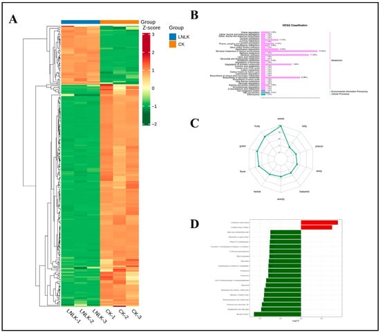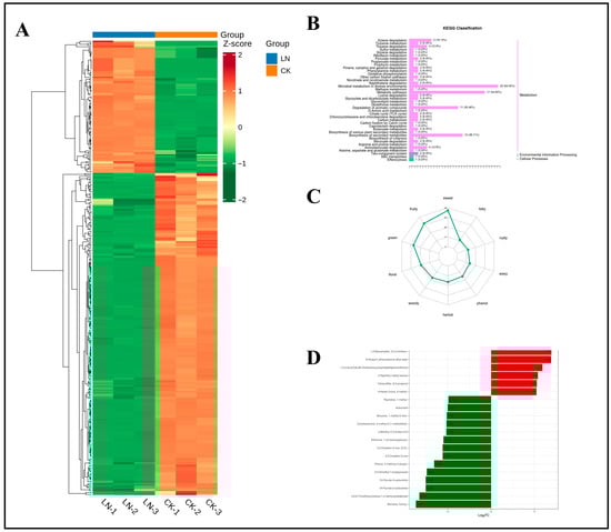 Clustering heatmap of differential metabolites under N deficiency, classification map of differential metabolite pathways, radar map of sensory flavor characterization of differential metabolites, and dynamic distribution of differences in the content of each of the top 20 substances corresponding to upward and downward grouping of differential changes. (A) Clustering heatmap of differential metabolites under nitrogen deficiency. (B) Classification map of differential metabolite pathways. (C) Radar plot of sensory flavor characterization of differential metabolites. (D) Bar chart of the top 20 substances with differential changes in differential metabolites. Note: The x-axis represents the log2FC of the differential metabolites; that is, the logarithm to the base 2 of the fold change of the differential metabolites. The y-axis represents the differential metabolites. Red indicates upregulation of metabolite content, and green indicates downregulation of metabolite content. In the KEGG diagram, the y-axis represents the names of metabolic pathways, and the x-axis represents the number of differential metabolites annotated to the pathway and the proportion of this number to the total number of annotated differential metabolites.
